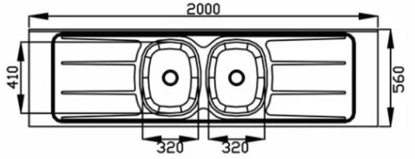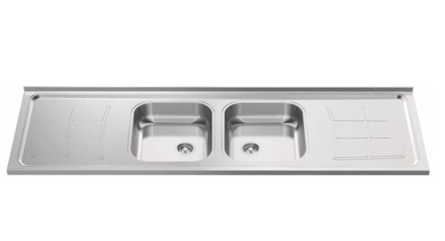 Pia de cozinha em aço inox-430 (200x56cm) com cuba dupla da Ghel Plus. Ideal para cozinhas amplas, oferecendo resistência, higiene e grande área de trabalho.